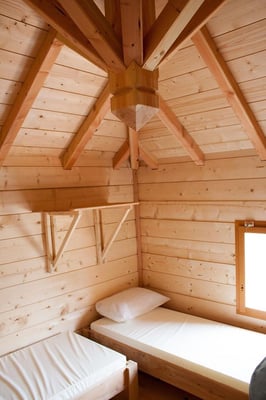 Het interieur van de Waterlodge is volledig van hout: 1 toilet, 1 douchecabine, 1 tweepersoonsbed en 2 stapelbedden.