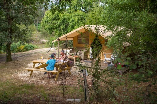 Liefhebbers kunnen kiezen voor de Cotton Lodge Nature in Dordogne in Domaine de l'Etang de Bazange. De tent bestaat uit hout en stof en is uitgerust met trendy meubels.